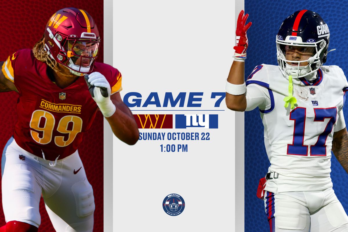 The New York Giants host the Washington Commanders in MetLife Stadium on Sunday, Oct. 22 in an NFC East matchup. Kickoff is set for 1:00 p.m. ET on CBS.