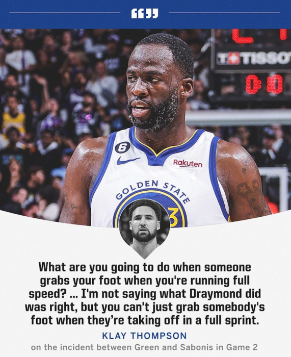 In watching the video replay numerous times, there are several more factors in this entanglement that just Sabonis getting the bottom of Green’s Converse. Pay close attention and you will see Sabonis attempt to hook the arm of Klay Thompson. As he’s succumbing to gravity, that grab slides to Green’s ankle.